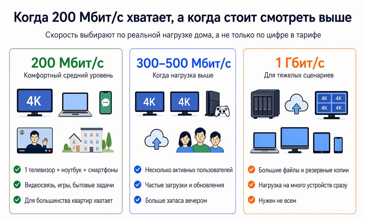 200 Мбит/с — это комфортный средний уровень, но для нескольких тяжелых сценариев одновременно может уже понадобиться более высокий тариф