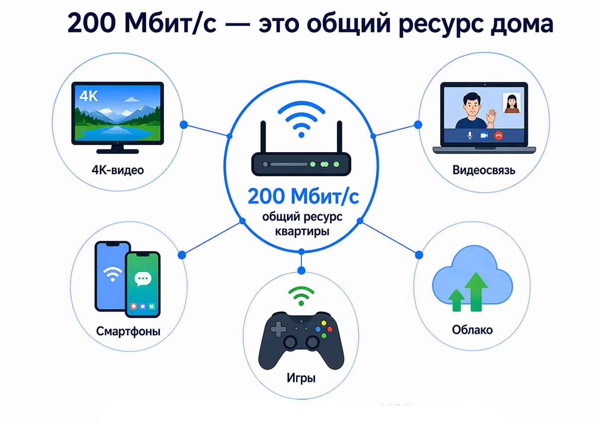 200 Мбит/с — это не скорость для одного устройства, а общий ресурс квартиры. Его делят между собой телевизоры, ноутбуки, телефоны, приставки, камеры, обновления, облачные сервисы и все остальные фоновые процессы. Поэтому тариф нельзя честно оценивать по одному сценарию вроде “я смотрю видео” или “я иногда играю”.